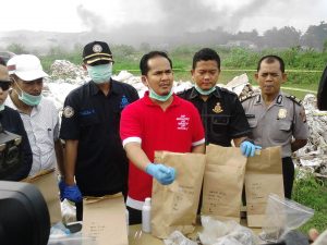 KARAWANG-Polres Karawang datangkan Tim Laboratorium Forensik (Labfor) Bareskrim Mabes Polri guna melakukan penelitian terhadap 78 ton karung beracun di Kampung Citaman, Desa Tamansari, Kabupaten Karawang, Jawa Barat, Jumat (19/1). Setidaknya 8 sample dari berbagai jenis seperti tanah, air hujan yang diduga telah terkontaminasi, coustik soda dan potongan karung bertuliskan PAC diambil sampelnya untuk diteliti lebih lanjut.