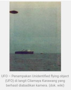 KARAWANG – Unidentified flying object (UFO) atau kerap disebut benda terbang aneh yang tak dikenal berbentuk cakram dan menjadi sebuah fenomena yang tampak di langit. Benda aneh yang kerap dikait-kaitkan dengan keberadaan mahluk luar angkasa ini ternyata pernah nampak di langit Cilamaya Kabupaten Karawang pada 22 September 1975.