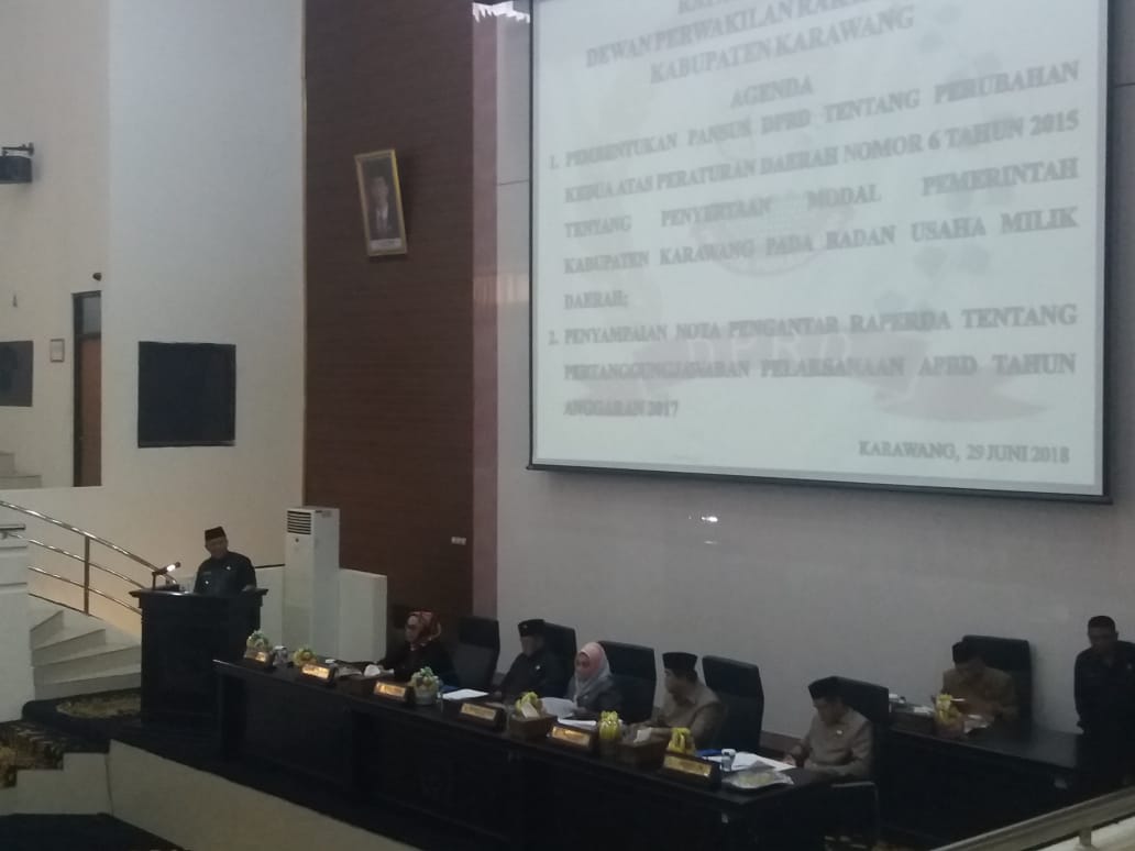 KARAWANG – Dewan Perwakilan Rakyat Daerah (DPRD) Kabupaten Karawang melangsungkan rapat paripurna DPRD dengan dua pembahasan. Yaitu agenda pembentukan Pansus DPRD tentang Perubahan Kedua atas Peraturan Daerah Nomor 6 Tahun 2015 Tentang Penyertaan Modal Pemerintah Daerah Kabupaten Karawang Pada Badan Usaha Milik Daerah dan Penyampaian Nota Pengantar Raperda tentang Pertanggungjawaban Pelaksanaan APBD Tahun Anggaran 2017, pada Jumat 29 Juni 2018.