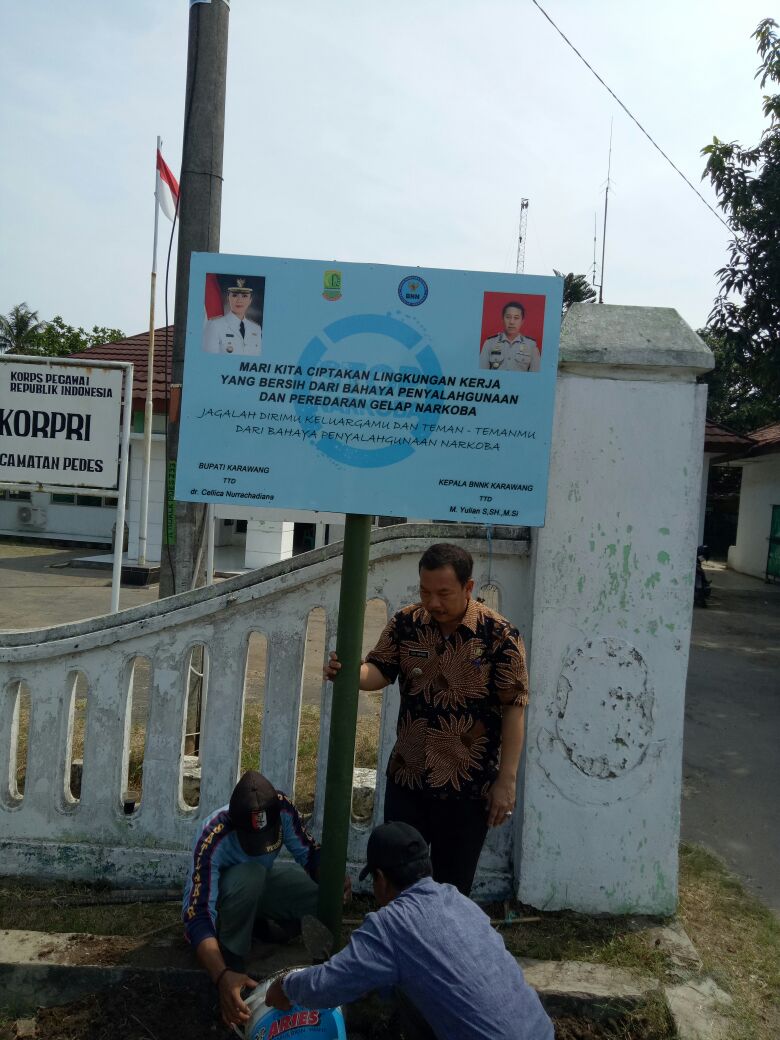 KARAWANG-Camat Pedes, Asep Supriyadi memasang plang himbauan tentang bahaya penyalahgunaan narkoba di depan kantor Kecamatan. Hal itu dilakukan sebagai bentuk kepeduliannya terkait bahaya penyalahgunaan narkoba yang penyebarannya sudah hampir disetiap lapisan masyarakat.
