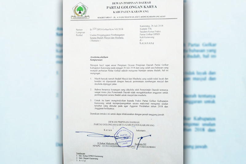 Ketua DPD Partai Golkar karawang, H. Sukur Mulyono, SH. mengatakan, selama ini alokasi anggaran untuk pembangunan atau pemeliharaan sarana ibadah tidak pernah ada, khususnya Masjid. Sangat memprihatinkan ketika melihat kondisi umat islam yang hendak membangun tempat ibadahnya, harus meminta minta sumbangan dipinggiran jalan dan lampu merah. Padahal, anggaran pendapatan Kabupaten Karawang itu sangat besar. Bukan tidak tahu, tetapi sepertinya Pemerintah Kabupaten (Pemkab) Karawang pura-pura tidak tahu atau memang tutup mata ketika melihat kondisi tersebut, sehingga tidak pernah berbuat apa-apa. “Kami, DPD Partai Golkar akan all out memperjuangan, melalui Fraksi Golkar di DPRD, untuk mengalokasikan anggaran pembangunan sarana ibadah dalam APBD 2019,” ujarnya kepada Fakta Jabar, Sabtu (28/7).