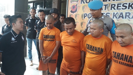 “Empat pelaku ditangkap di rumahnya masing-masing, yaitu BS (26), AYP (24), LT (25) NS (31) dan seorang lagi, WL (30) dinyatakan buron. saat ini, jajaran Satreskrim Polres Karawang masih memburu rekan pelaku yang masih buron,” jelasnya saat ekspose di Mapolres Karawang, Selasa (16/10).