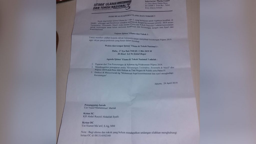 KARAWANG-Realis ijtima ulama dan tokoh nasional berupa secarik kertas sudah beredar di Karawang. Isi dari realis tersebut berupa tindak lanjut dugaan kecurangan terstruktur pada Pemilu 2019 dengan menggelar ijtima ulama dan tokoh 3.
