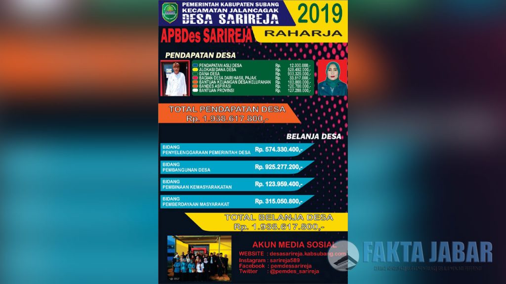Kepala Desa Sarireja, Nugraha ketika dikonfirmasi Fakta Jabar Jum, at(14/5/2019) mengatakan, pemasangan baliho pengelolaan APBDes ini dilakukan sejak 3 tahun anggaran terakhir. Pemasangan baligho ini dilakukan sesuai dengan amanat perundang-undangan dan anjuran Pendamping Desa, agar masyarakat ikut mengawal dana desa (DD) maupun alokasi dana desa (ADD) yang lebih dari 1 miliar.