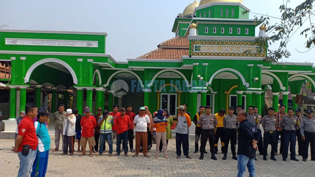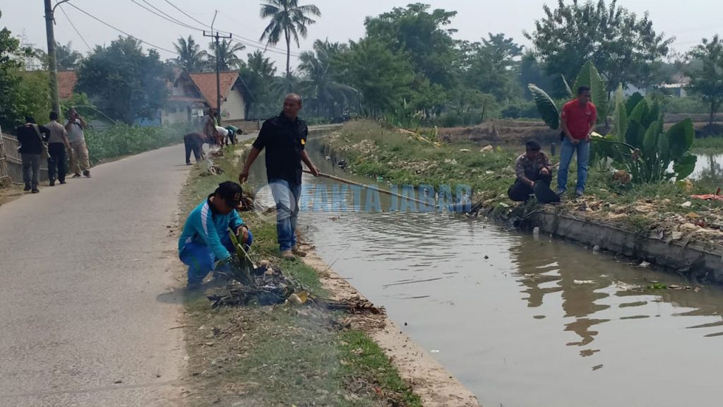 KARAWANG-Puluhan anggota Polsek Teluk Jambe Barat dan masyarakat sekitar bergotong-royong membersihkan tempat ibadah hingga saluran irigasi dan tempat ibadah di jalan raya karangligar, Desa Karangligar, Kecamatan Telukjambe Barat, Sabtu (22/6).