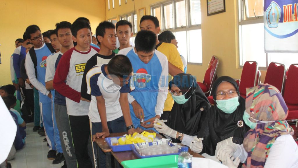 KARAWANG– Ratusan siswa SMKN 1 Karawang melakukan tes Urine untuk cek Narkoba sebagai bentuk upaya menjalankan program P4GN sesuai peraturan daerah nomor 9 tahun 2019, Rabu (11/9).