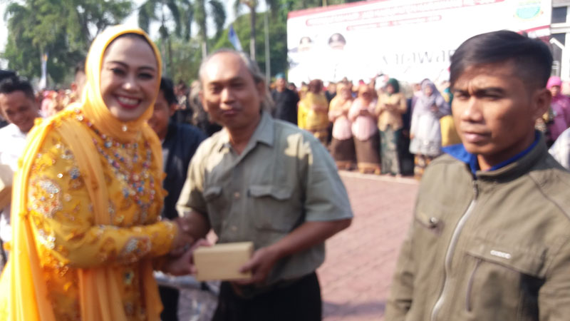Pemberian hadiah diberikan oleh Bupati Karawang pada Apel HUT Karawang ke-386 di Plaza Pemkab Karawang, Sabtu (14/9/2019).(cim)