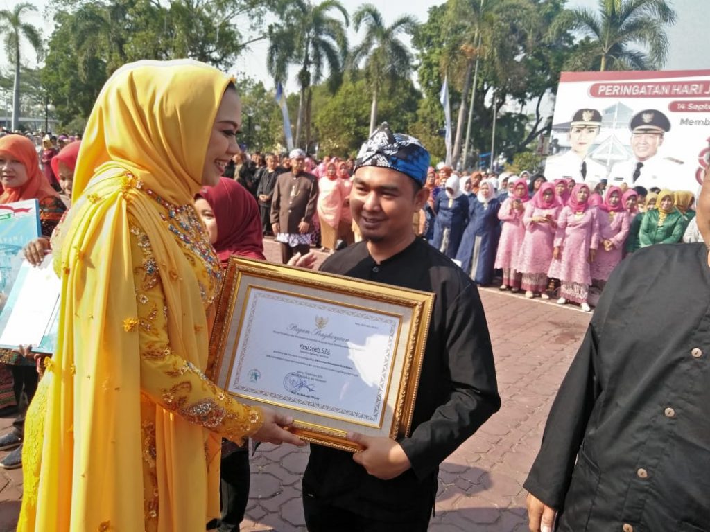KARAWANG– Direktur Pusat Kegiatan Belajar Masyarakat (PKBM) Assolahiyah Karawang, Heru Saleh M.Pd kembali menerima piagam penghargaan Anugerah Pegiat Pendidikan Keaksaraan yang diserahkan langsung oleh Bupati Karawang, dr. Cellica Nurrachadiana di puncak Hari Ulang Tahun (HUT) Kabupaten Karawang ke-386 tahun, Sabtu (14/9/2019) pagi.