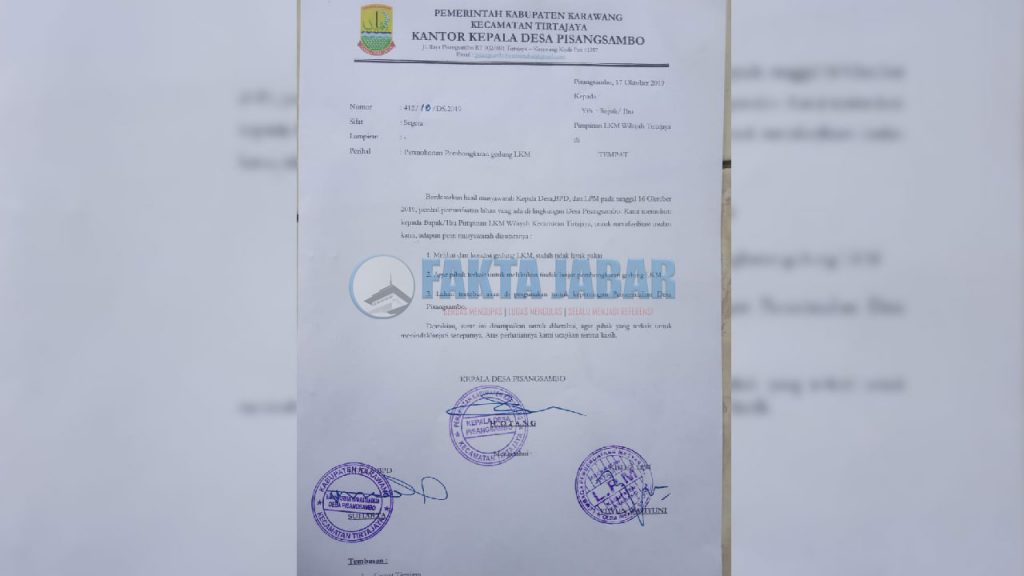 Dalam surat tertanggal 17 Oktober 2019, pihak desa meminta pimpinan LKM di wilayah Tirtajaya menyetujui permohonan pihak desa. Sedikitnya ada tiga poin yang dikemukakan pihak desa dalam permohonan pembongkaran gedung Cabang LKM Tirtajaya tersebut.