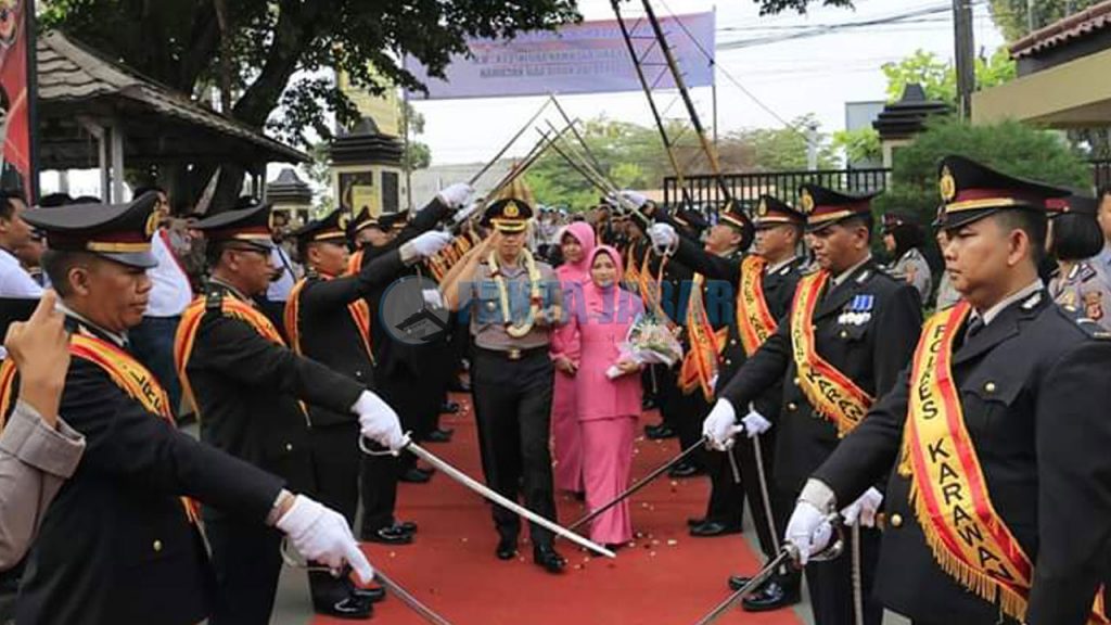 Penyambutan Kapolres baru itu berlangsung khidmat mulai dari gerbang masuk Mapolres Karawang hingga menuju ruang lobi yang disertai jejeran perwira dengan memegang pedang pora serta mengangkat pedang pora sebagai tanda penghormatan kepada Kapolres baru.