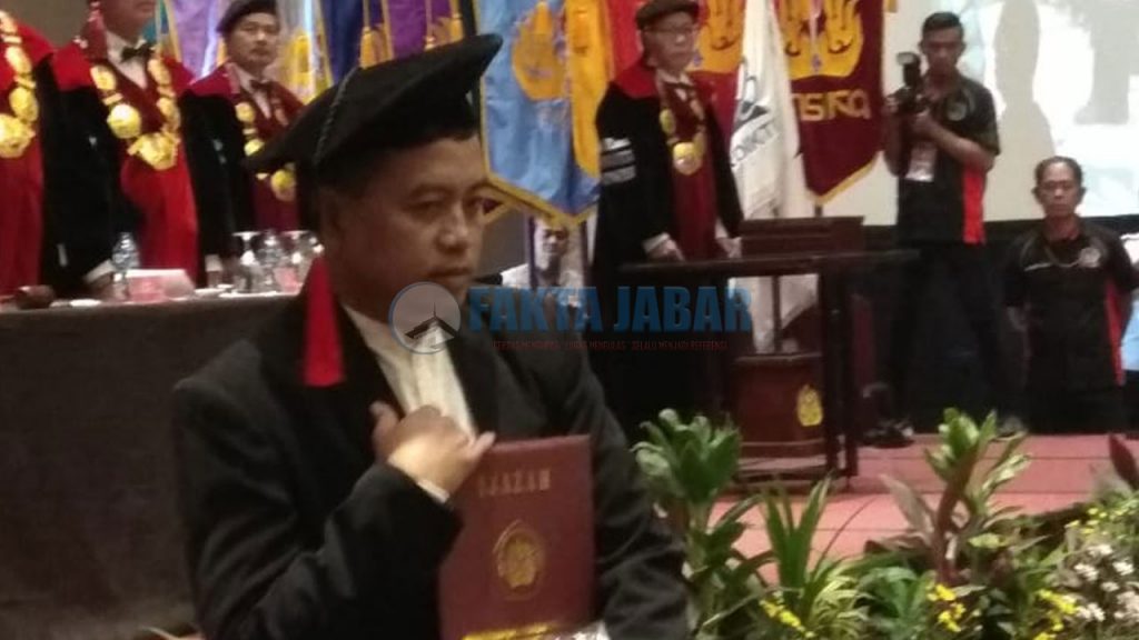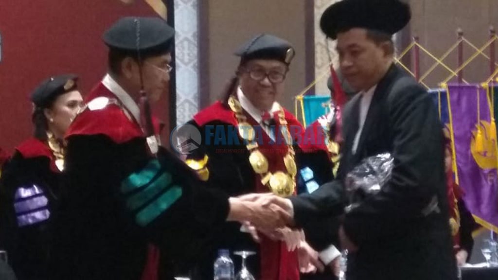 KARAWANG – Suasana berbeda nampak saat pelaksanaan Prosesi Wisuda di hari kedua Universitas Singaperbangsa Karawang (Unsika), Rabu (18/12). Pasalnya, aura kebahagiaan yang biasanya dirasakan saat wisudawan dipanggil satu persatu ke depan panggung untuk dilakukan prosesi pemindahan tali dari samping kiri kepala ke samping kanan kepala oleh Rektor, seketika menjadi haru saat Asep Suwarno menggantikan putranya, Agus Supriyatna, S.Kom.