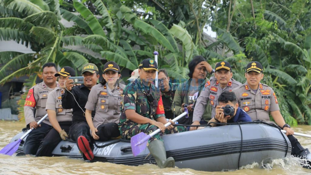 KARAWANG– Kapolres Karawang, AKBP Arif Rachman Arifin dan Dandim 0604/Karawang, Letkol Inf. Medi Haryo Wibowo berjibaku melakukan evakuasi korban banjir dan menggelar kegiatan Bakti sosial di Desa Karang Ligar, Kecamatan Telukjambe Barat, Rabu (1/1).