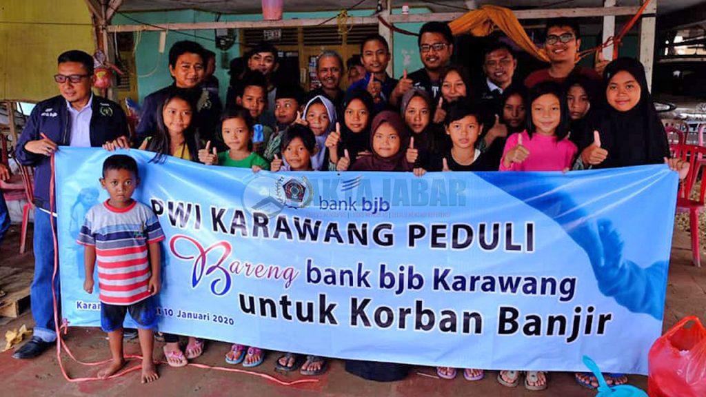 KARAWANG – PWI Kabupaten Karawang bersama Bank Jabar Karawang menggelar aksi sosial dengan memberikan trauma healing kepada anak – anak korban banjir di Desa Karangligar Kecamatan Telukjambe Barat, Jumat (10/1/2020).