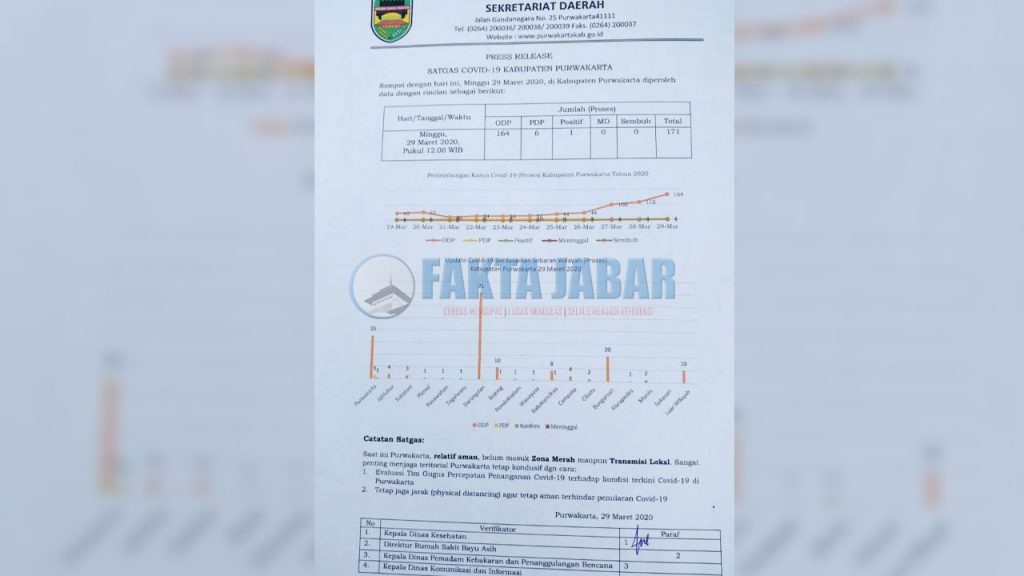 PURWAKARTA – Satuan Tugas Khusus (Satgassus) Covid-19 Kabupaten Purwakarta kembali menginformasikan perkembangan penanganan dan penanggulan Covid-19 di wilayah Kabupaten Purwakarta, Minggu 29 Maret 2020 pukul 12.00 WIB.