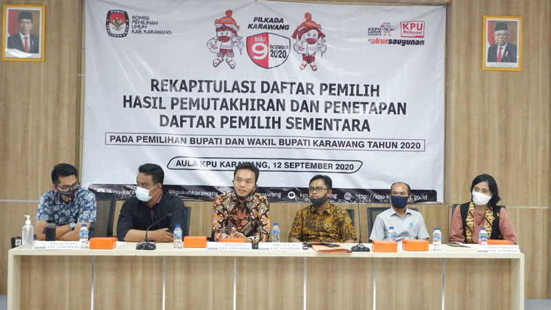 KARAWANG – Komisi Pemilihan Umum (KPU) Kabupaten Karawang menggelar rapat pleno rekapitulasi daftar pemilih hasil pemutakhiran dan penetapan daftar pemilih sementara, Pemilihan Bupati dan Wakil Bupati Karawang 2020, Sabtu (12/9) di Aula KPU Kabupaten Karawang.