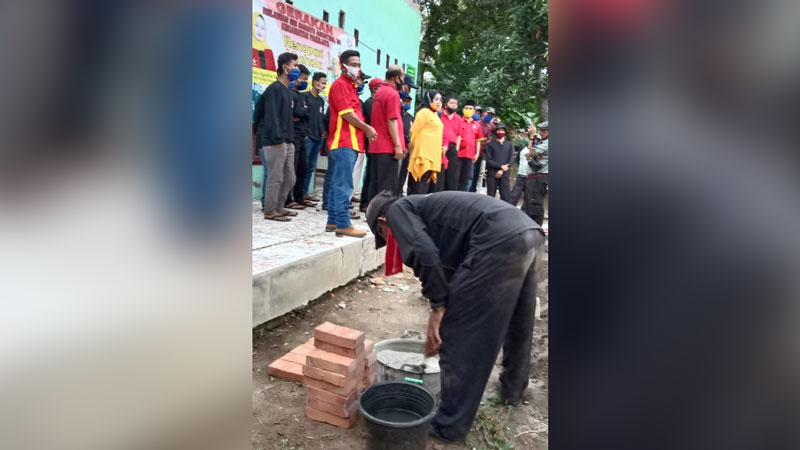 Usai sambutan, Ketua SOKI Karawang meletakan batu bata pertama sebagai simbolik dimulai renovasi mushola. Pihaknya juga menyerahkan bantuan untuk kebutuhan mushola.