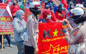 Pasalnya, hal tersebut sebagai upaya pencegahan penyebaran covid-19. Bahkan petugas keamanan dari Polwan dan Satpol PP tersebut membagikan masker pada pengunjukrasa.