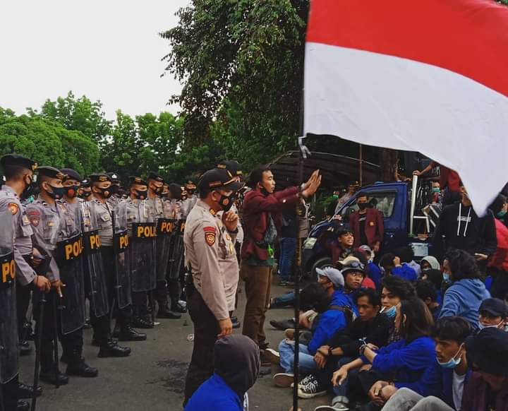 “Kami turun ke jalan karena adanya bentuk ketidakadilan yang telah dilakukan oleh DPR,” kata orator dalam orasinya diatas mobil komando, Selasa (20/10/2020).