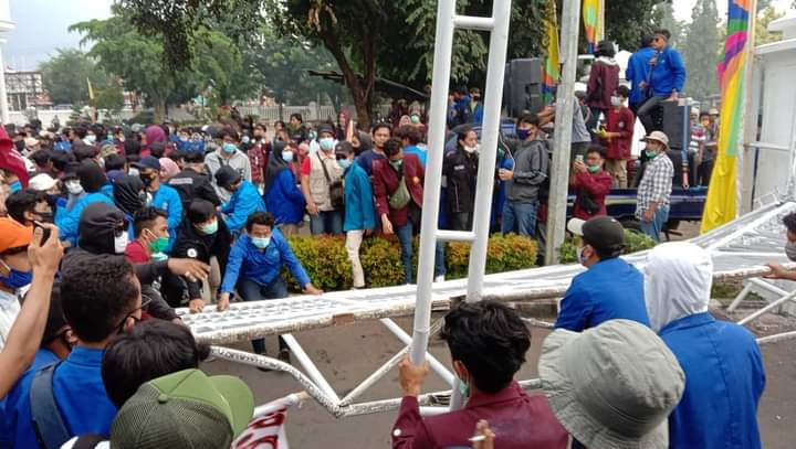 Karawang – Unjukrasa aliansi mahasiswa Pangkal Perjuangan berujung “jebol” pintu gerbang DPRD Kabupaten Karawang, Selasa (20/10/2020).