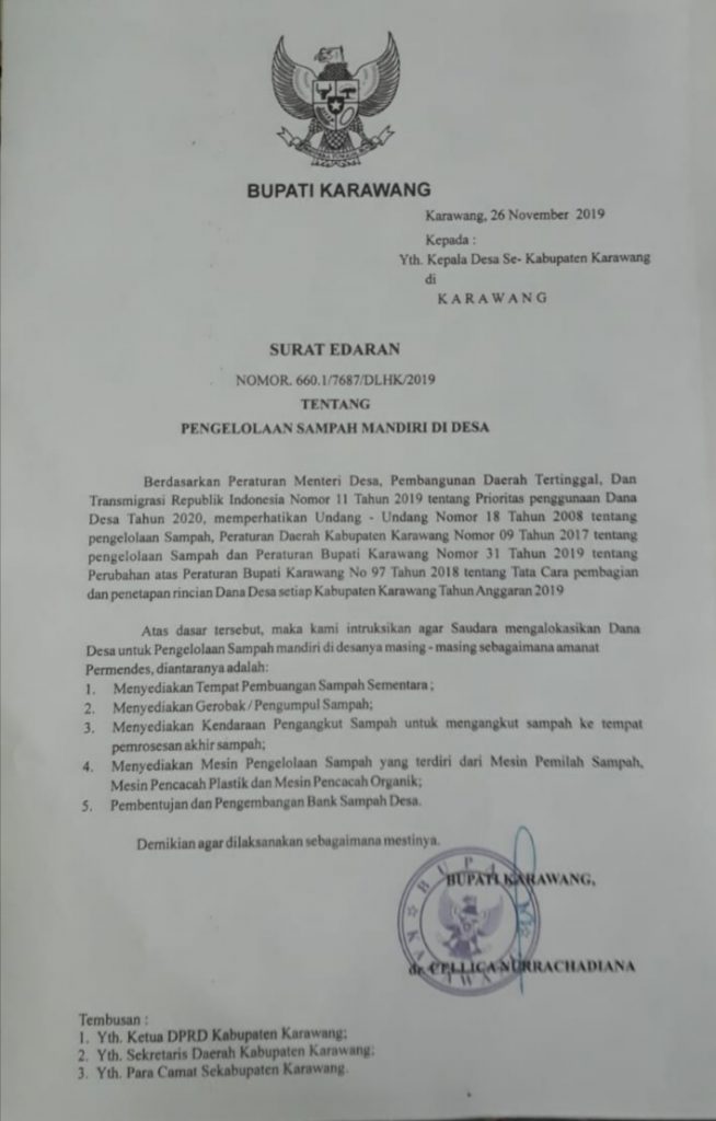 Berdasarkan Surat Edaran Bupati Karawang Nomor.660.1/7687/DLHK/2019 pada 26 Nopember 2019 yang ditunjukan untuk Kepala Desa se Karawang. Surat edaran itu tentang pengelolaan sampah mandiri di desa.