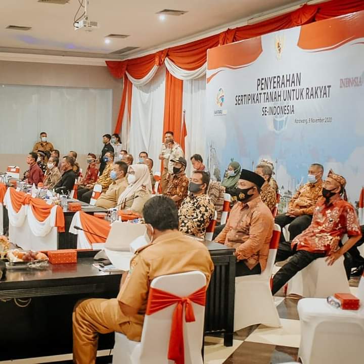 Karawang – Pjs Bupati Karawang, Dr. Ir. H. Yerry Yanuar, MM., secara simbolis menyerahkan sertifikat tanah ke sejumlah warga yang sebelumnya telah diserahkan oleh Presiden Jokowi secara virtual di Istana Presiden, Senin (9/11/2020) siang.