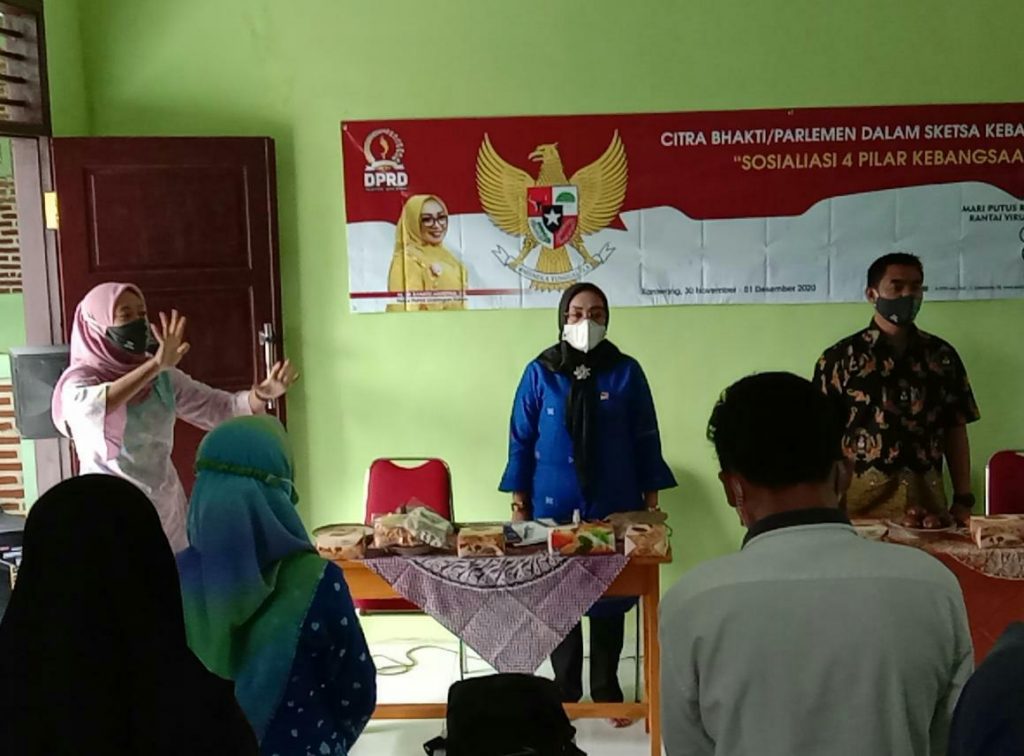 Karawang – Anggota Dewan Perwakilan Rakyat Daerah (DPRD) Provinsi Jawa Barat, Hj Sri Rahayu Agustina menggelar citra bhakti/parlemen dalam sketsa kebangsaan sosialisasi 4 pilar kebangsaan kepada Pusat Kegiatan Belajar Masyarakat (PKBM) Assolahiyah Desa Pasirjaya Kecamatan Cilamaya Kulon, Senin (30/11/2020).