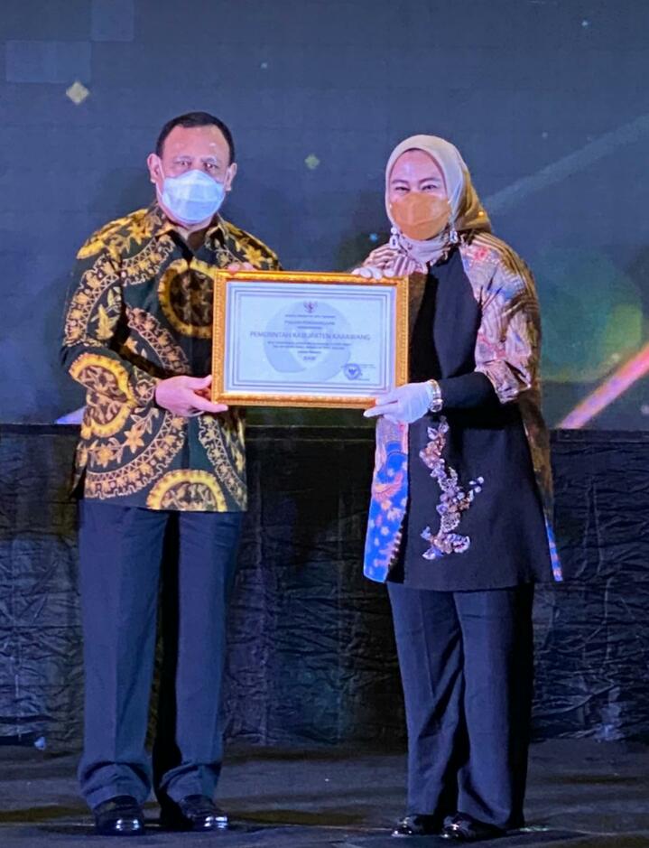 Penghargaan tersebut diterima oleh Bupati Karawang, dr. Hj. Cellica Nurrachadiana. Penghargaan diberikan oleh Ketua KPK Komjen Pol Drs. Firli Bahuri.