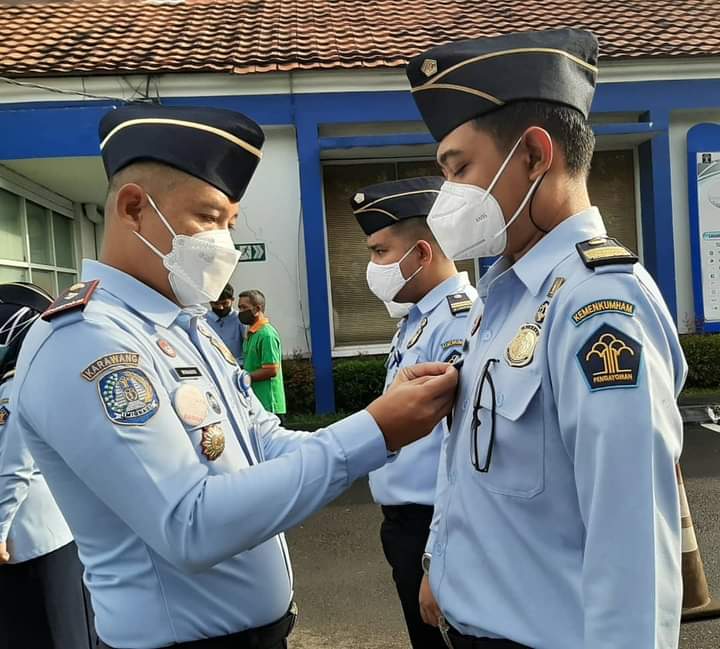 Karawang – Kepala Kantor Imigrasi Kelas I Non TPI Karawang, Winarko, melakukan penyematan secara simbolis pin Wilayah Birokrasi Bersih dan Melayani (WBBM). Kegiatan tersebut dilaksanakan saat Apel Pagi di Halaman Kantor Imigrasi Karawang, Senin (01/02/2021).