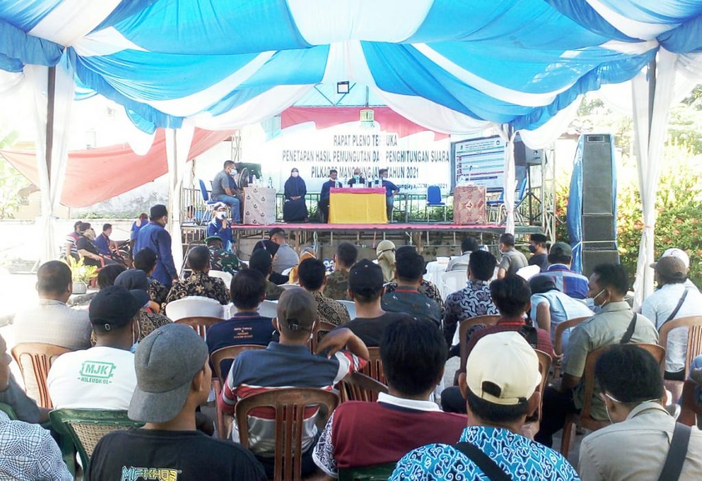 Lalu no urut 2 memperoleh 517 suara, kemudian no urut 3 memperoleh 1587 suara. Rapat Pleno Terbuka hari ini digelar secara resmi oleh panitia 11Pilkades Manggungjaya, dengan tetap menerapkan protokol kesehatan, dihadiri perwakilan tingkat kecamatan, BPD dan para saksi dari kandidat cakades, hadir juga perangkat keamanan dari TNI hingga satpol PP.