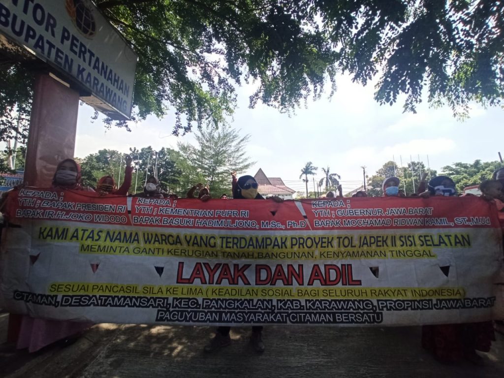 Karawang – Puluhan warga Kampung Citaman, Desa Tamansari, Kecamatan Pangkalan, Karawang yang berdemonstrasi di kantor BPN (Badan Pertanahan Nasional) Karawang dinilai salah alamat. Pasalnya, BPN tidak terlibat dalam penentuan harga ganti untung tanah dalam proyek pembangunan tol Japek II sisi Selatan.