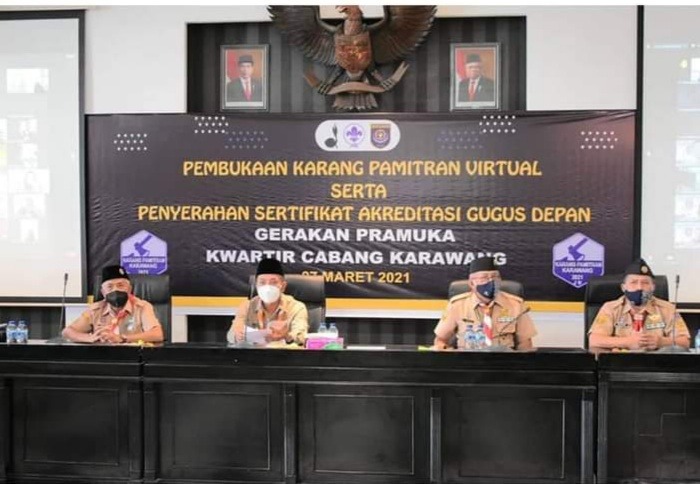 Karawang – Wakil Bupati H. Aep Saepuloh S.E secara resmi membuka Karawang Pamitran Virtual sekaligus menyerahkan sertifikat akreditasi Gugus Depan Gerakan Pramuka untuk sejumlah sekolah dasar, lanjutan pertama dan menengah atas di Gedung Comand Center lantai 3, Komplek Pemda Karawang, Sabtu (27/3). Hadir dalam kegiatan tersebut jajaran pengurus Gerakan Pramuka Kwarcab Karawang dan perwakilan dari masing-masing sekolah penerima sertifikat akreditasi.