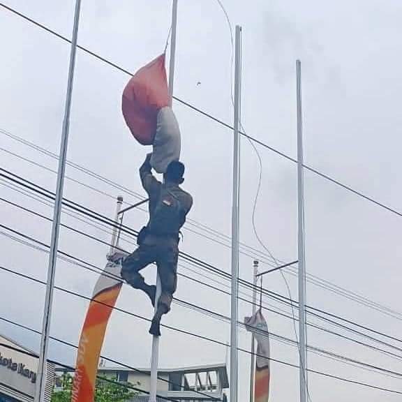 Meski kesulitan, anggota berusaha untuk menurunkan bendera tersebut manjat sampai penghujung tiang. Sebab, tali bendera itu putuh dan menyangkut di kabel.