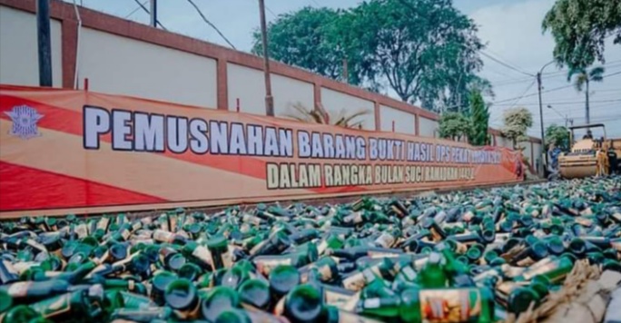 Karawang – Sebanyak 10.524 botol minuman keras, 1.121 butir obat keras, 102 unit knalpot bising dan 2.150 petasan dimusnahkan oleh Polres Karawang. Senin 12 April 2021 pagi.