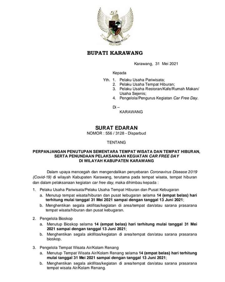 Karawang – Pemerintah Kabupaten (Pemkab) Karawang menerbitkan Surat Edaran (SE) Bupati mengenai Perpanjangan Penutupan Sementara Tempat Wisata dan Tempat Hiburan Serta Penundaan Pelaksanaan Kegiatan Car Free Day di Wilayah Kabupaten Karawang.