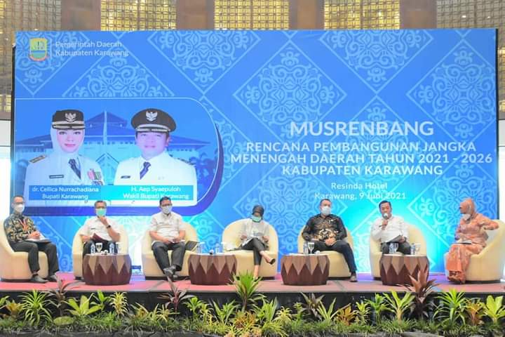 Karawang – Bupati Karawang, dr. Hj. Cellica Nurrachadiana secara resmi membuka Musyawarah Perencanaan Pembangunan (Musrenbang) RPJMD Kabupaten Karawang 2021 – 2026. Acara berlangsung di Ballroom Resinda Hotel, Rabu (9/6/2021) siang.