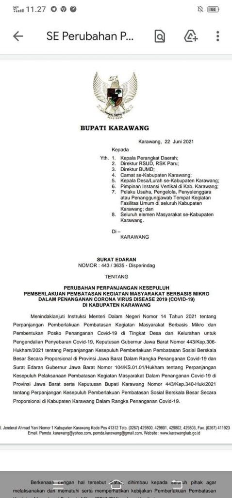 Bupati Karawang, dr. Hj. Cellica Nurrachadiana mengeluarkan Surat Edaran Nomor: 443/3635 -Disperindag tentang Perubahan Perpanjangan Ke-10 Pemberlakuan Pembatasan Kegiatan Masyarakat Berbasis Mikro Dalam Penanganan Covid-19 di Kabupaten Karawang.