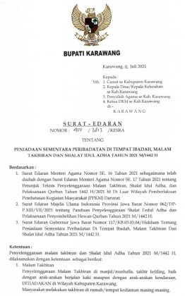 Karawang – Pemerintah Kabupaten Karawang mengeluarkan surat edaran pelaksanaan Shalat Idul Adha dan malam takbiran ditiadakan sementara. Alasannya, karena Karawang masih pemberlakukan pembatasan kegiatan masyarakat PPKM darurat.
