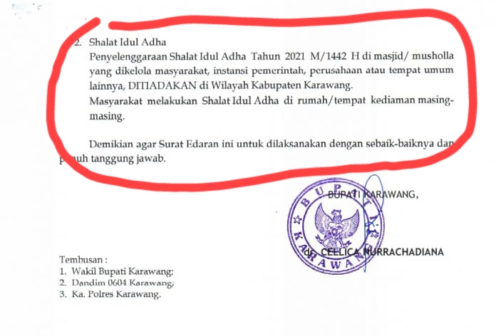 Isi Surat Edaran Bupati Karawang Nomor :450/3813/KESRA berdasarkan sebagai berikut : Jelang Hari Raya Idul Adha 1442 H, Pemkab Karawang mengeluarkan Surat Edaran (SE) Bupati tentang peniadaan sementara tempat peribadatan ditempat ibadah, malam takbiran dan sholat Idul Adha.