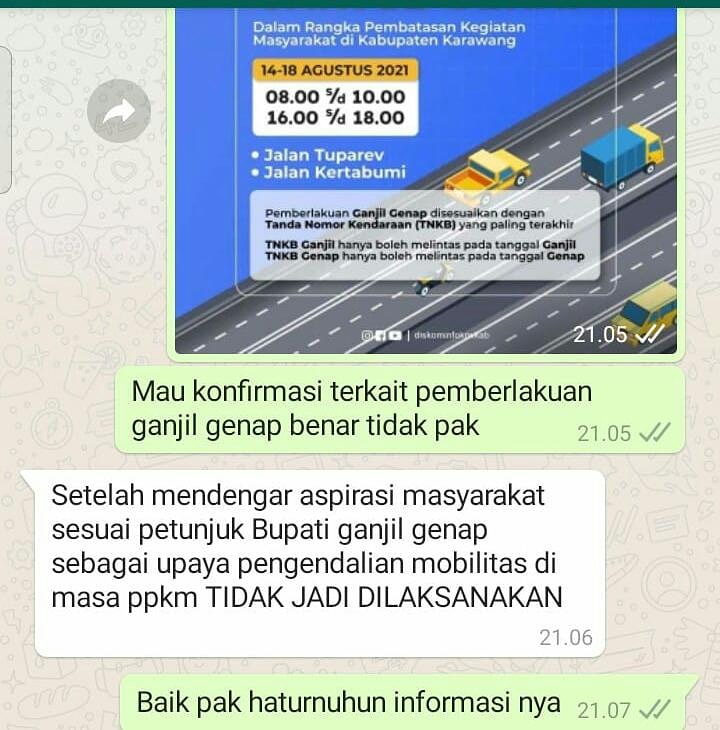 Sebelumnya informasi yang beredar rencana pemberlakuan ganjil genap merupakan hasil rapat bersama antara perwakilan Polres, Dishub, PUPR, Diskominfo dan PRKP di Kantor Dishub, Jumat (13/8).(Baca juga :Karawang Berlakukan TNKB Ganjil Genap di Kawasan Tuparev dan Kertabumi).