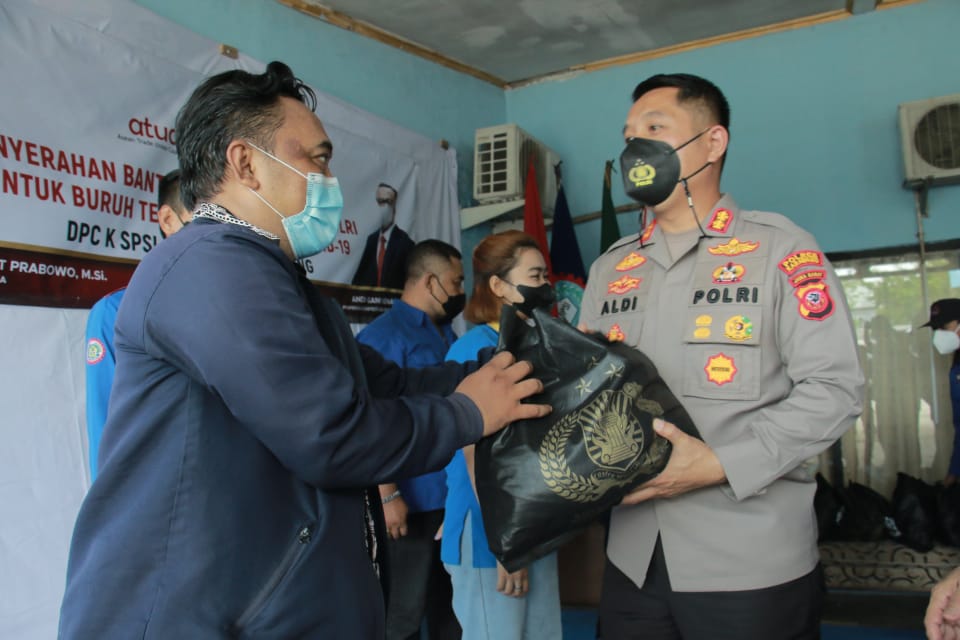 Karawang – Kapolres Karawang AKBP Aldi Subartono memberikan secara simbolis “Penyerahan bantuan dari Kapolri untuk Buruh yang terdampak Covid- 19” kepada DPC KSPSI Kabupaten Karawang, bertempat di kantor DPC K SPSI Karawang, yang beralamat di Dusun Sukamanah Kelurahan Karawang Wetan Kecamatan Karawang Timur Kabupaten Karawang, Selasa (2/11/2021).