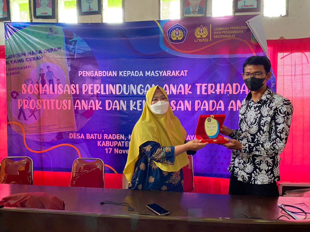 Oci Senjaya, SH., MH selaku pemateri menerangkan bahwa kegiatan sosialisasi tersebut selain mengimplementasikan Tri Dharma Perguruan Tinggi, kegiatan sosialisasi kepada masyarakat tujuannya ialah agar masyarakat mengetahui bagaimana cara melakukan perlindungan anak terhadap prostitusi anak dan kekerasan pada anak.