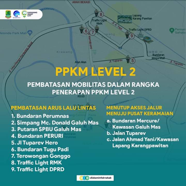 “Pelaksanaan penerapan PPKM Level 2 di Wilayah Kabupaten Karawang direncanakan untuk dilaksanakan dengan mengikuti pola pembatasan kegiatan seperti yang sudah dilaksanakan dengan menutup akses jalur menuju pusat keramaian,” ujarnya.