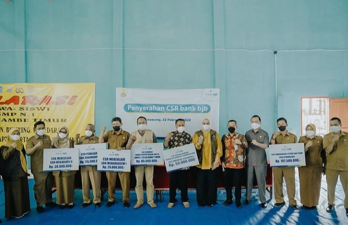 Karawang – Pemerintah Kabupaten (Pemkab) Karawang bersama Bank BJB menyalurkan dana Coorporate Social Responsibilty (CSR) sebesar Rp. 407.000.000.00. Bantuan CSR tersebut menyasar pada lingkungan serta dunia pendidikan. Penyerahan bantuan dilaksanakan di Aula SMPN 1 Telukjambe Timur, Selasa (22/2/2022) siang.