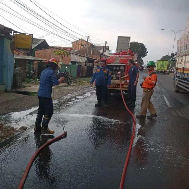 Karawang – Tumpahan oli di Jalan Raya Ahmad Yani, Desa Babakan Jati, Kecamatan Cikampek, Kabupaten Karawang dibersihkan oleh Pos Pemadam Kebakaran (Damkar) dan Penyelamatan Wilayah Cikampek.