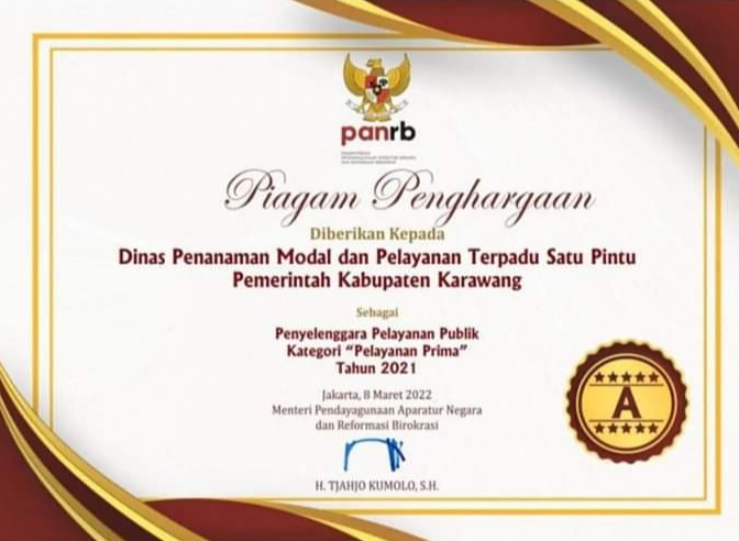 Karawang – Dinas Penanaman Modal dan Pelayanan Terpadu Satu Pintu (DPMPTSP) Kabupaten Karawang mendapatkan penghargaan pada Penyelenggara Pelayanan Publik Kategori ‘Pelayanan Prima’ dari Kementerian Pendayagunaan Aparatur Negera dan Reformasi Birokrasi (KemenPan-RB).