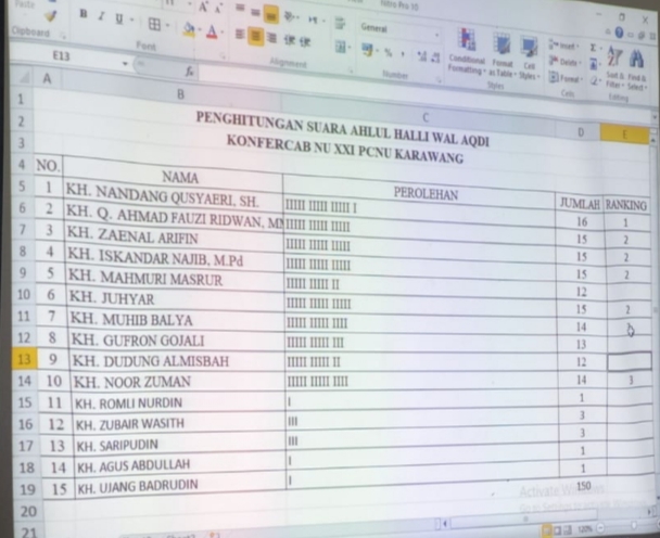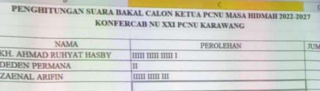 Sebelumnya, konfercab memutuskan KH Nandang Qusyaeri sebagai Rois Syuriah. Setelah itu dilanjutkan penghitungan suara dari 30 Majelis Wakil Cabang (MWC) plus 1 incumbent untuk memilih calon Ketua NU Karawang.