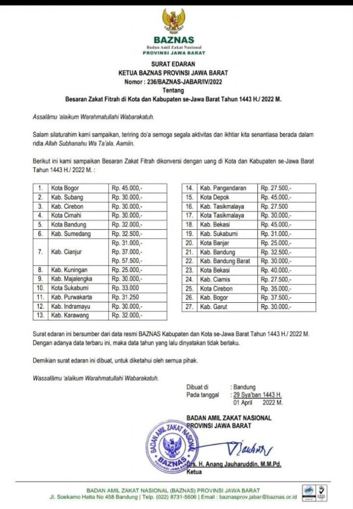 Surat edaran ini bersumber dari data resmi BAZNAS Kabupaten dan Kola se-Jawa Barat Tahun 1443 H/ 2022 M.