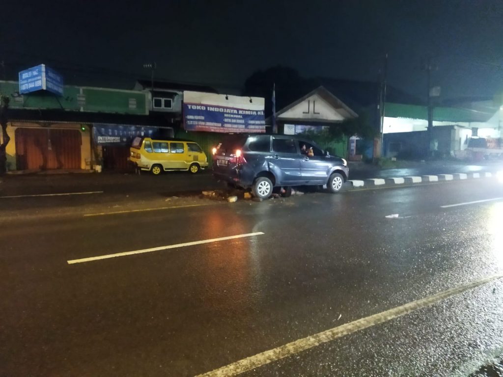 Karawang – Mobil Avanza tersangkut setelah menabrak trotoar tepat di depan Desa Anggadita, Klari, Kabupaten Karawang, Selasa (26/4/2022) dini hari.