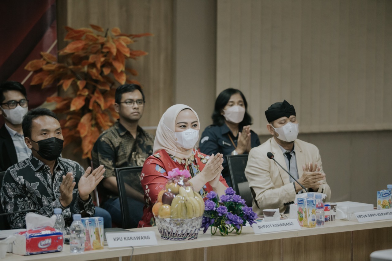 Bupati Karawang, dr. Hj. Cellica Nurrachadiana mengikuti kegiatan tersebut secara daring di kantor KPU Karawang didampingi Bawaslu Jawa Barat, Ketua KPU Karawang dan Wakil DPRD Karawang.