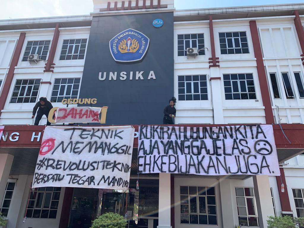 Karawang – Puluhan mahasiswa Fakultas Teknik Unsika (Universitas Singaperbangsa Karawang) berunjuk rasa di depan gedung H. Opon Unsika, Senin (1/8/2022). Selain berunjuk rasa, mahasiswa membentang beberapa spanduk di gedung H. Opon dan melakukan salat berjemaah di depan gedung H. Opon.